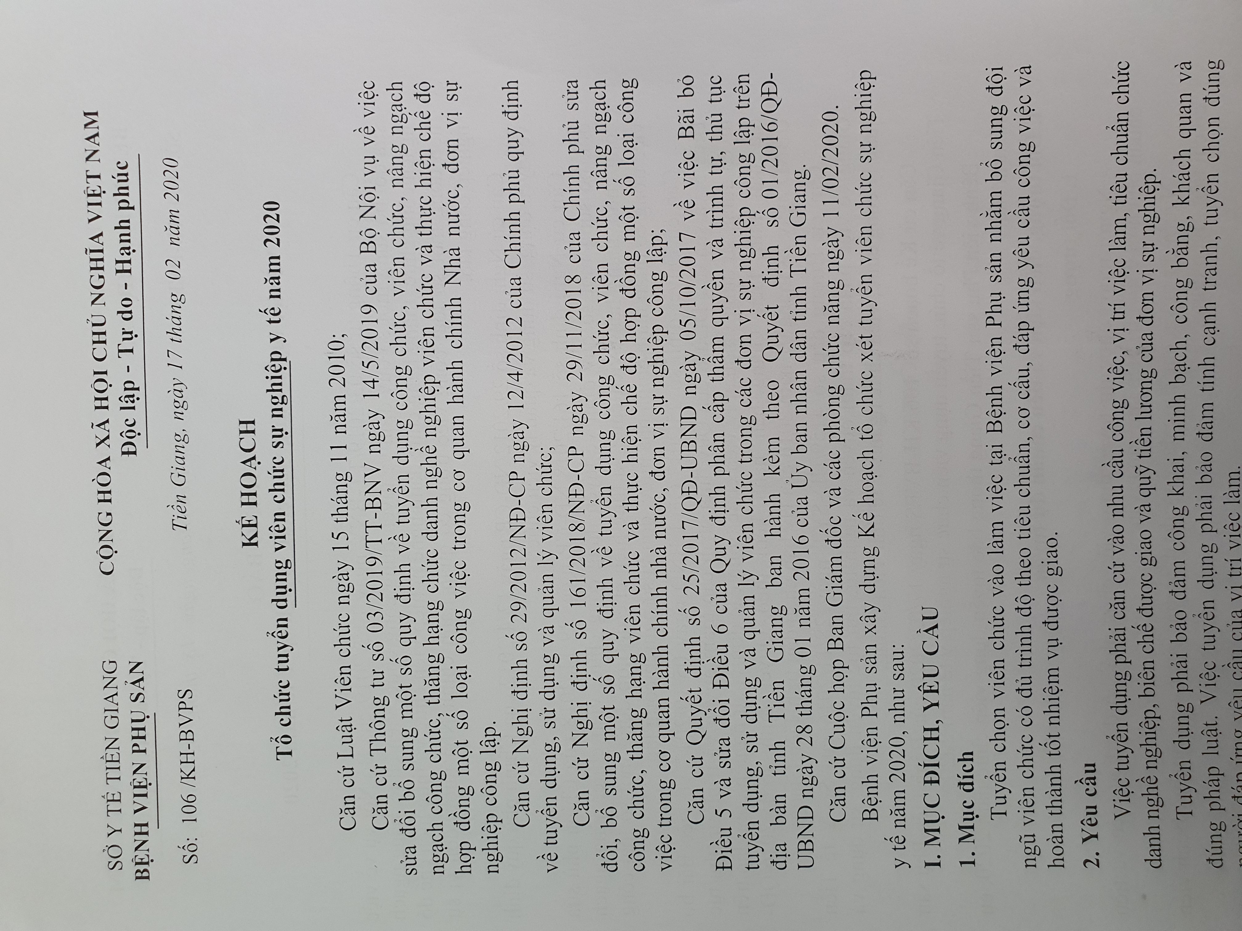 Kế hoạch số 106 /KH-BVPSngàyV/v Tổ chức tuyển dụng viên chức sự nghiệp y tế năm 2020 17/02/2020