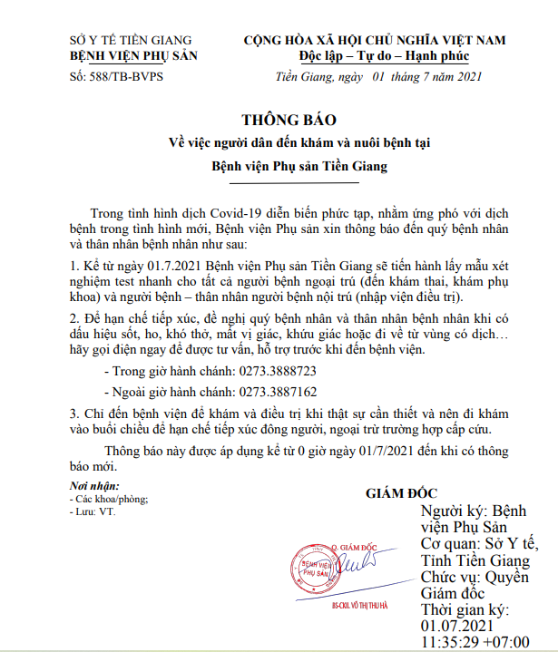 Thông báo số 588/TB-BVPS ngày 01/7/2021 Về việc người dân đến khám, nuôi bệnh tại Bệnh viện Phụ sản Tiền Giang