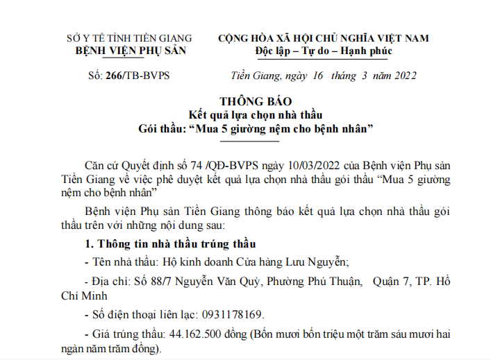Số: 266/TB-BVPS Tiền Giang, ngày 16 tháng 3 năm 2022